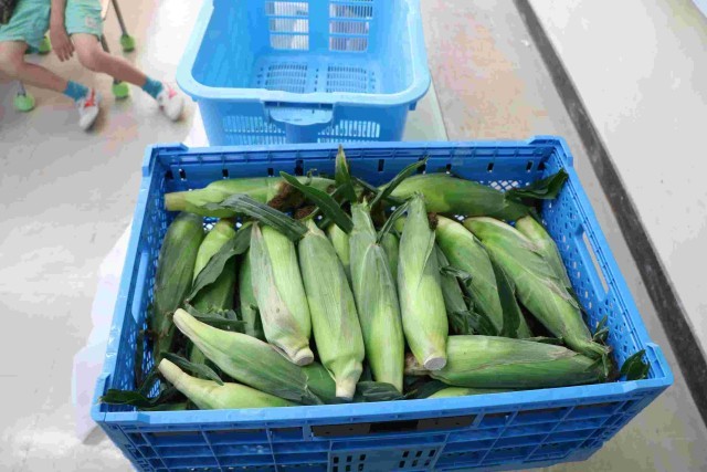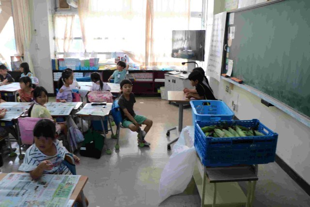 今日は、食育の一環で1年生がとうもろこしの皮むきをします。