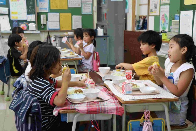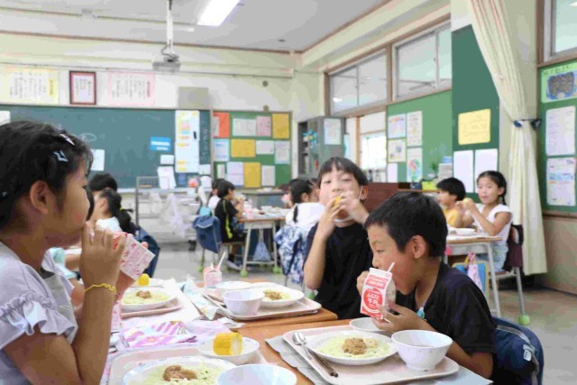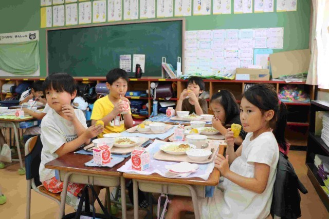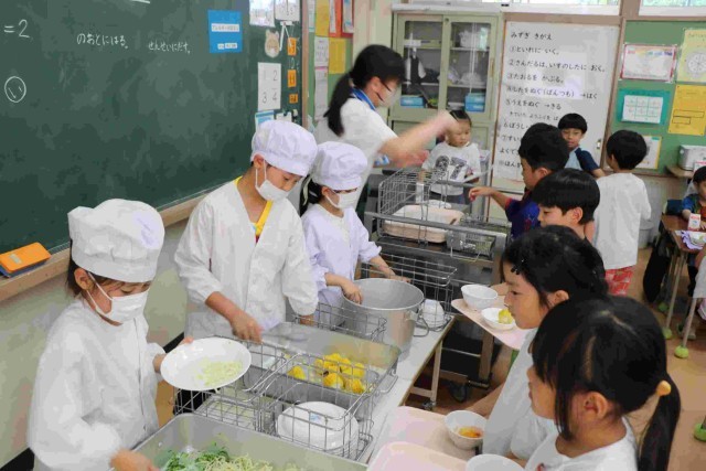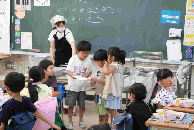 給食の時間になりました。1年生が皮むきをしたことが書かれた紹介文を嬉しそうに読む1年生です。