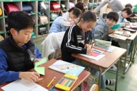 3年生書初めの練習の様子です。練習用紙をなぞって書いたり、指でなぞりながら確認し...
