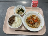 【今日の献立】・ごはん・かみかみ佃煮・豚肉と大根のうま煮・和風サラダ・牛乳明日1...
