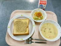 【今日の献立】・セサミトーストクラムチャウダー・パリパリサラダ・牛乳パリパリサラ...