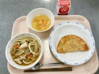 【今日の献立】・けんちんうどん・チーズとマヨポテトのパリッと揚げ・フルーツポンチ...