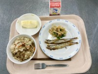 【今日の献立】・豚肉とごぼうのごはん・ししゃもの甘辛だれ・カリカリ油揚げと野菜の...