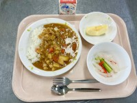 【今日の献立】・ひよこ豆のカレーライス・ピクルス・りんご・牛乳