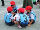 「チームタイム」でゲームの振り返りをしています。作戦はどうだったか、考えている姿...