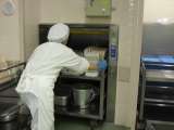 できあがった給食を、教室に運ぶためのリフト(人が乗れないエレベーター) にのせ...