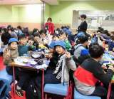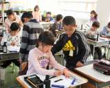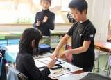 2年生が3年生から習字を教えてもらいました。初めて習字道具を見たという子もたくさ...