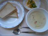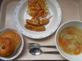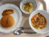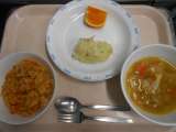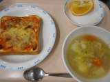 今日の給食はピザトーストと春キャベツがたっぷり入ったチキンポトフと デザートは今...