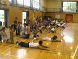 梅雨の時期で、なかなか校庭での朝トレができません。今日は、体育館で仲良し班対抗の...