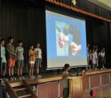 今日の児童集会は保健給食委員会の発表です。委員会の主な仕事(1 水質検査、2 栄...
