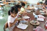 「プラ板キーホルダーを作ろう」の様子です。自分の作りたい図案を下に敷き、透明のプ...