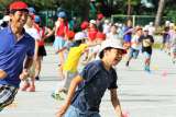 今朝の児童集会は集会委員会によるゲーム集会です。白帽子をかぶった子どもたちは、赤...