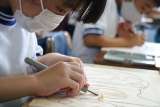 彫刻刀それぞれの使い方を知り、掘った模様が違うことを楽しみながら彫り進めています...