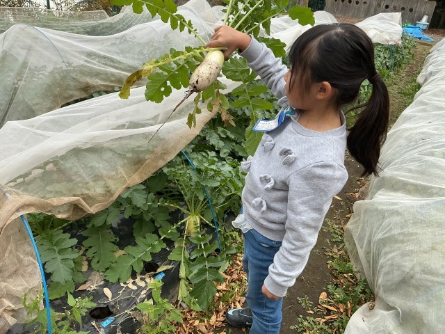 1.2年生が大根を収穫しました。こんなに大きくなっている〜と、長いダイコンにびっ...