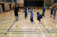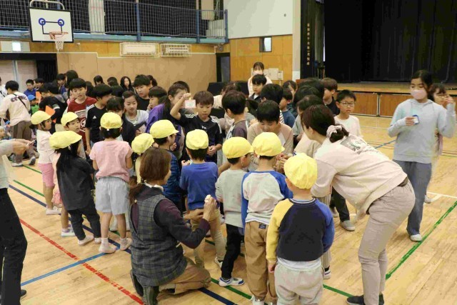 校庭と体育館に分かれて一緒に遊んでいる様子です。おにごっこ、しっぽとり、だるまさ...