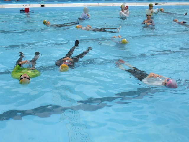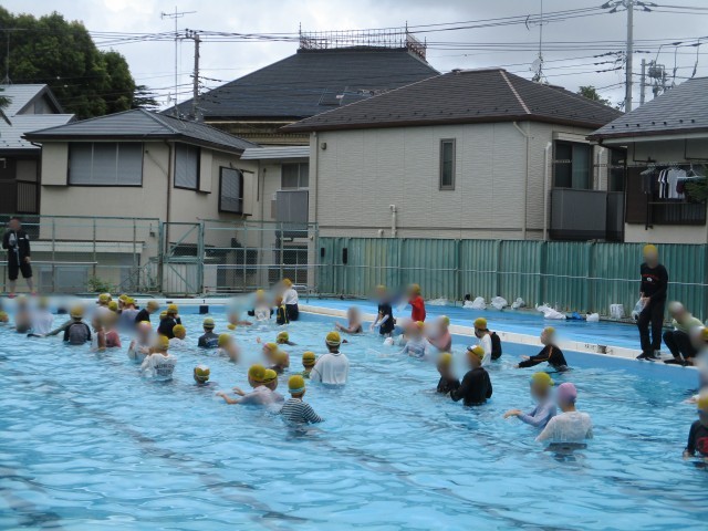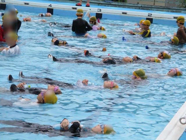 長袖長ズボンを着衣したまま、水につかる着衣泳を実施しました。ペットボトルや服の隙間に入れた空気を利用して、仰向けに浮く体験をしました。