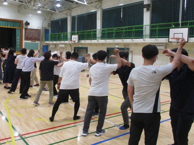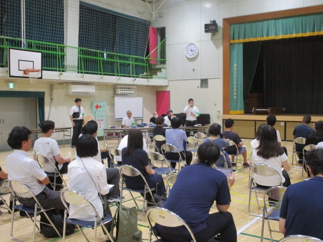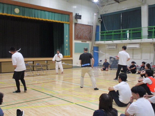 第1部の実技訓練は、教室内の児童の安全確保をし、実際に通報して警察が現場に到着するまで不審者を食い止めるところまで行いました。非常に緊迫感のある訓練となりました。第2部は、警察の方より実技訓練の講評や不審者対応についての講義をいただき、さすまたを使った実技訓練等を行いました。