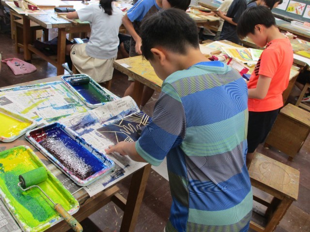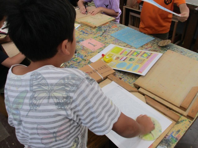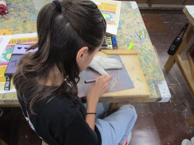彫刻刀を使った多色刷りの木版画です。「彫ったところが残る」という性質を理解して、彫りと刷りを繰り返しながら、作品を仕上げていきます。