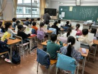 鑑賞の授業です。「ファランドール」の曲を聴き、2つの旋律の特徴をつかみます。ペープサートを活用し、曲の構成や反復、重なりを味わっています。