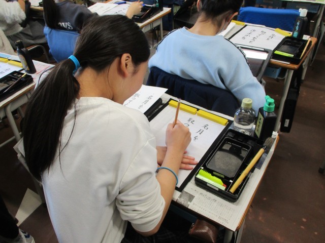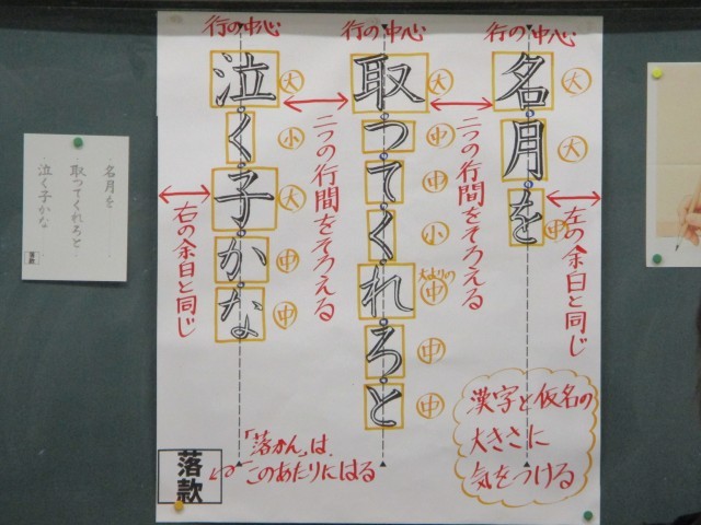 小林一茶の有名な俳句を、小筆で書きます。行の中心に気を付けて、集中して練習しています。