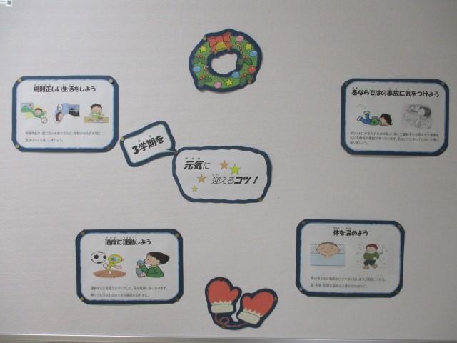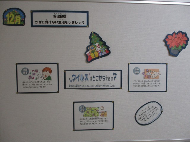 保健室前掲示板 公開日 2025/12/08 更新日 2025/12/08 今日のできごと ぐんと気温が下がり、寒くなってきました。12月の保健目標は「かぜに負けない生活をしましょう」です。ウイルスを寄せ付けないために、こまめな換気と手洗い・うがいが大切です。 いいね(0)