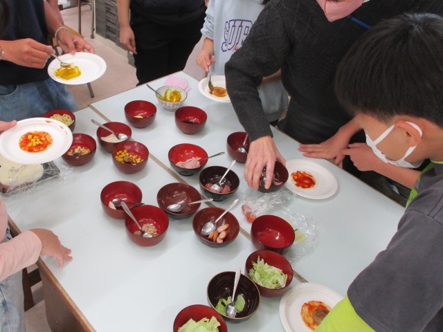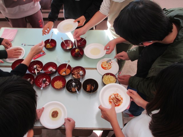 2学期最後のすまいるルームは、お楽しみ調理実習です。餃子の皮に、自分たちで決めたトッピングを載せてホットプレートで焼いていきます。お互いに声を掛けながら、まわりのお友達のことも考えて量を調節し、上手に盛り付けていました。
