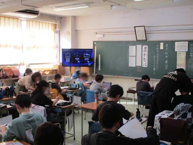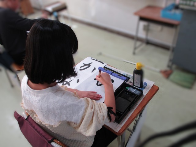 書き初めの練習です。冬休みの宿題で取り組み、1月に書き初め会を行います。みんな集中して練習しています。