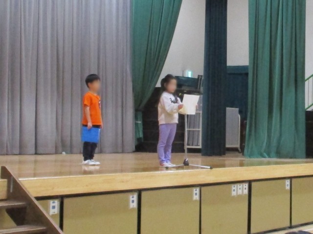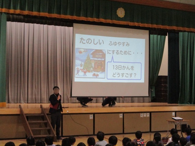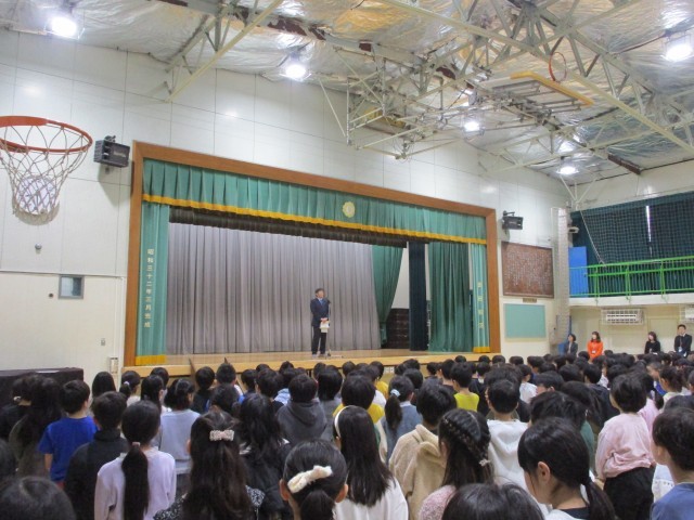 今日で2学期最後となりました。全校児童が体育館に集まって、2学期終業式を行いました。児童代表の言葉は1年生。今学期に頑張ったことなどを堂々と発表することができました。終業式の後は、生活指導の先生より、冬休みの過ごし方についてお話しました。3学期始業式に元気に会えるよう、安全に気を付けて楽しくすごしてほしいと願っています。