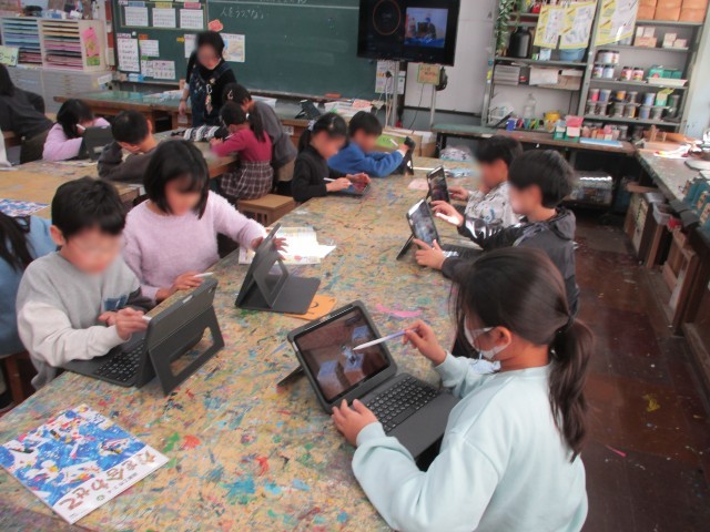 図工【4年生】 公開日 2026/01/13 更新日 2026/01/13 今日のできごと タブレットを使った表現活動です。撮影した画像に、大きさを工夫して絵を描き足していきます。著作権や肖像権など、ネットリテラシーについても学びます。 いいね(1)