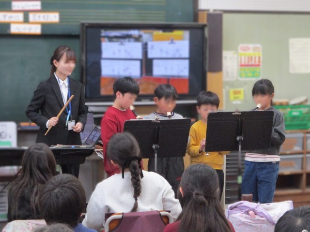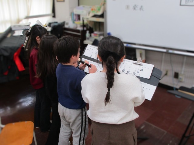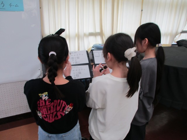 これまで鑑賞で学んだ祭り囃子のリズムを生かして、一人一人が作った「ラドレの音の旋律」を、今日はグループで話し合って8小節の旋律を作りました。各自のフレーズの順番を真剣に考え、一つのお囃子を作り上げました。