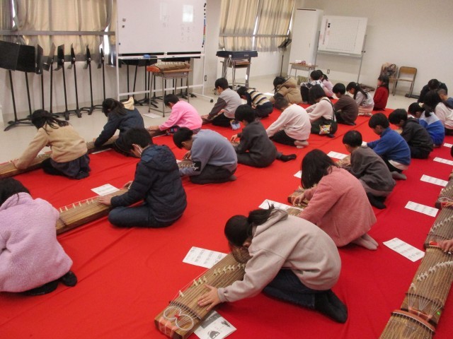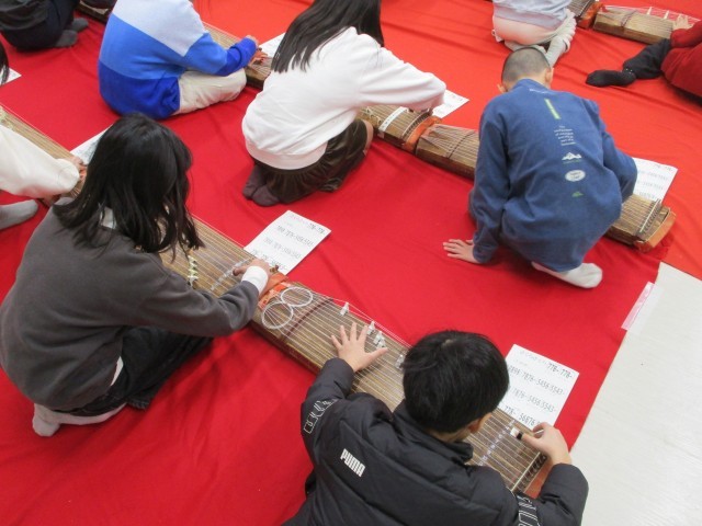 箏体験【4年生】 公開日 2026/01/23 更新日 2026/01/23 今日のできごと 毎年実施しているお箏の体験授業です。講師の先生が、たくさんのお箏を持って来てくださり、一人一面のお箏で練習することができました。ほとんどの子どもたちが初めてお箏に触れましたが、先生のご指導のおかげで、「さくらさくら」を演奏できるようになりました。 いいね(0)