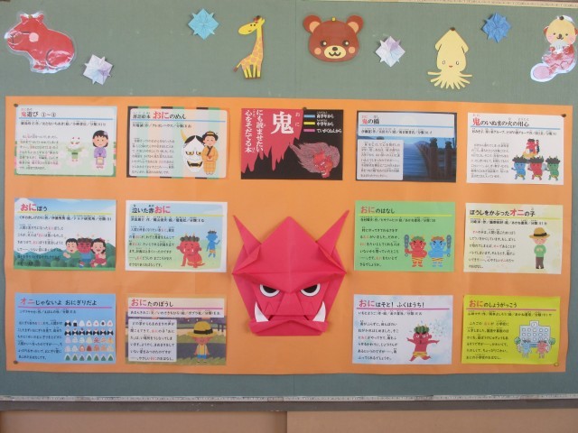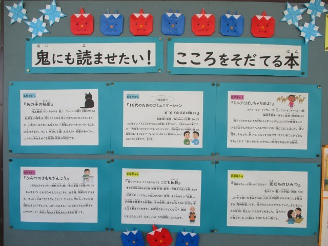 2月の図書室前の掲示板です。節分にちなみ、鬼をテーマにした本などを紹介しています。