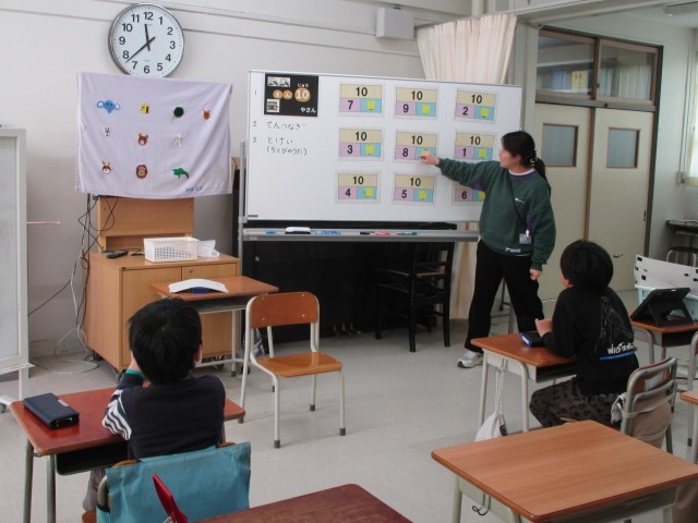 低学年グループの算数です。10の分解・合成について、動作化を取り入れて学習しています。