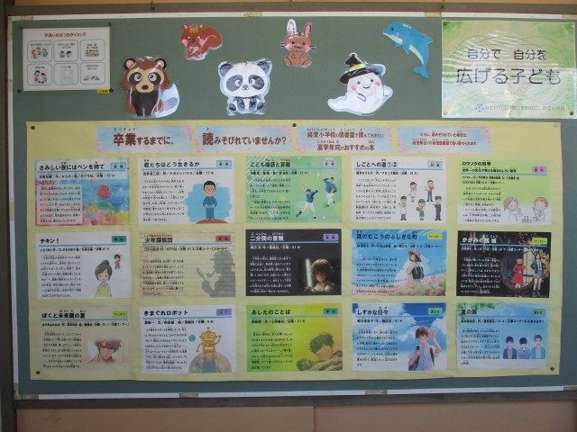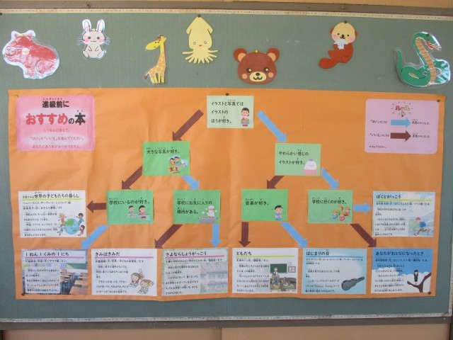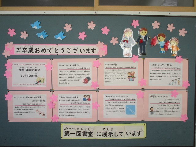 図書室前の掲示板です。今回は進級・卒業企画です。もうすぐ卒業する6年生には卒業前に是非読んでほしい本を、在校生にはフローチャートで好みに合わせた本を紹介しています。