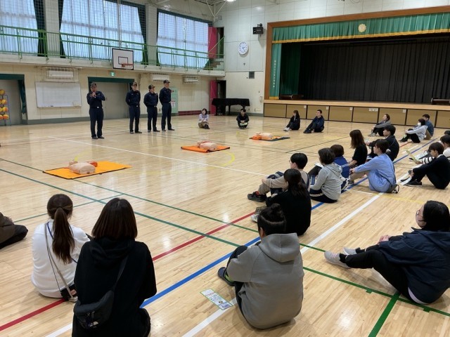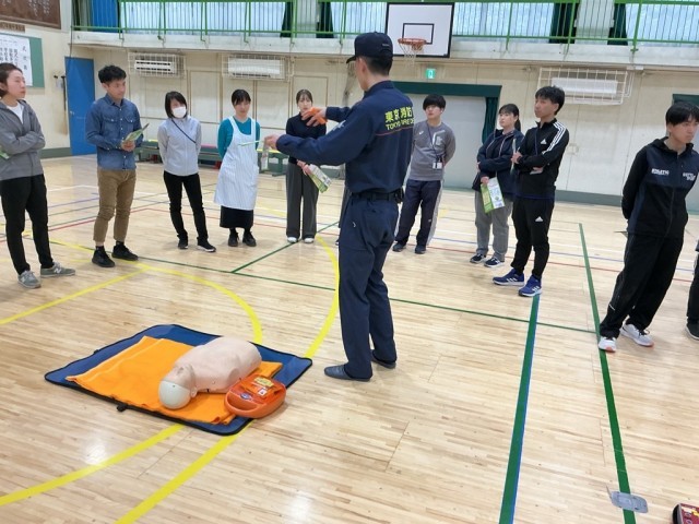 世田谷消防署の方をお招きして、AED(自動体外式除細動器)の使い方について実践を通して学びました。