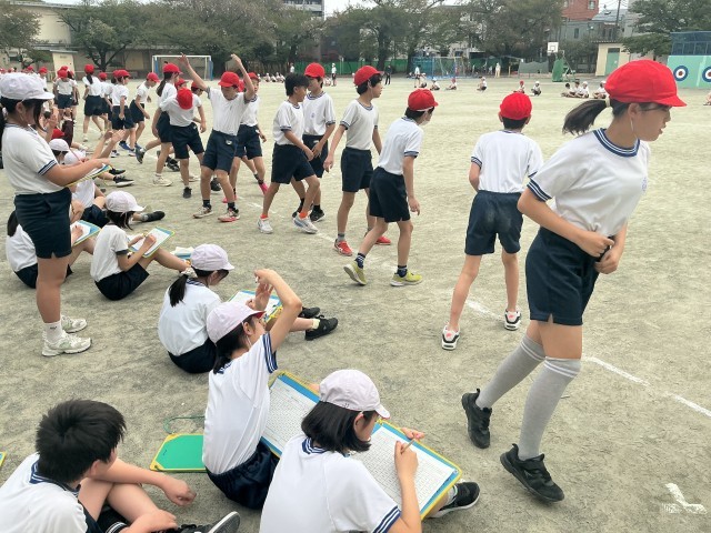 3人グループになって1人が走り、2人がサイドに分かれて記録をとります。