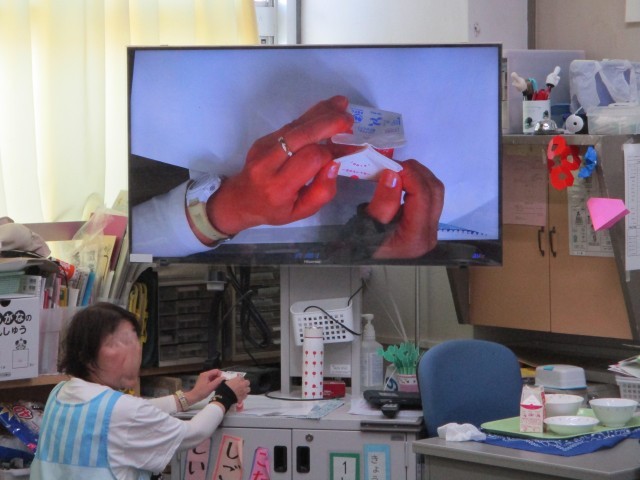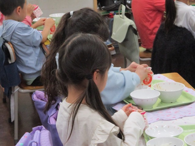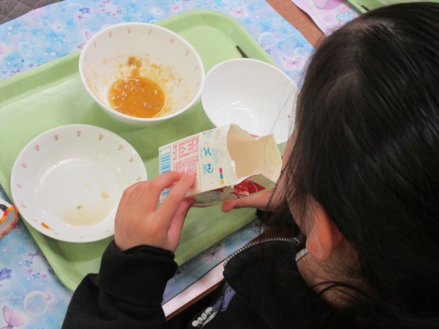 食後の片付けの難関は、牛乳パックをたたむことです。先生と一緒に確認しながら、牛乳パックを開いてたたみます。