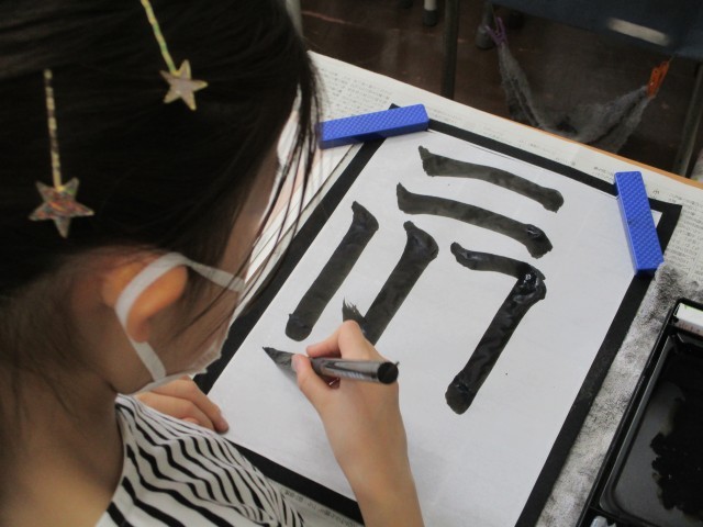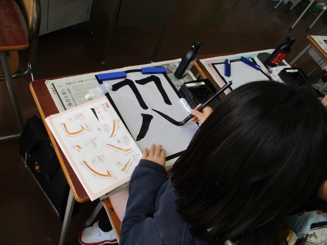 書写【4年生】 公開日 2025/04/21 更新日 2025/04/21 今日のできごと 4年生の毛筆の授業です。3年生で学習したことをもとに、点やはらい、折れやはねなど、様々な点画を練習しました。 いいね(0)