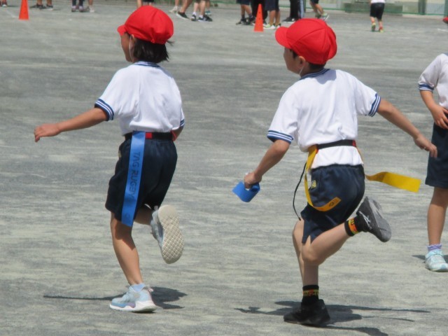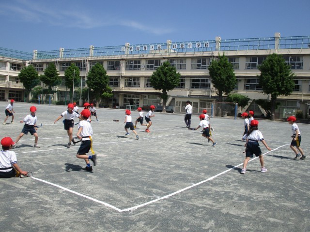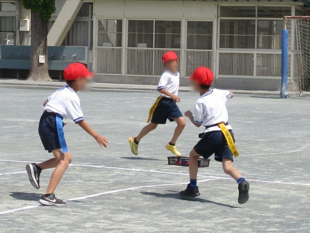 「たからとりおに」の第1時です。タグの付け方を確認してから、タグを取る鬼と逃げるチームに分かれてゲームをしました。安全に気を付けながら存分に走り、ゲームを楽しむことができました。