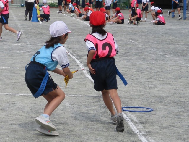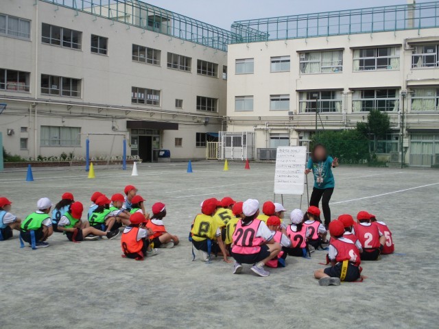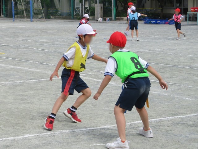 「たからとりおに」の学習です。今日からはチームで協力して作戦を実施します。「フェイント作戦」や「スピード作戦」など、チームで話し合った作戦を実行しました。