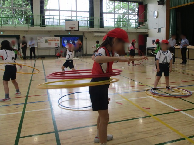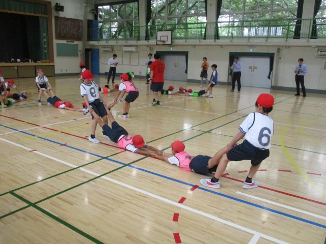 「体つくり運動」領域の学習です。「めざせ!運動マスター!」と題し、多様な動きをつくる運動に取り組みます。動きのこつやポイント、行い方について、友達と伝え合いながら、楽しく運動しています。