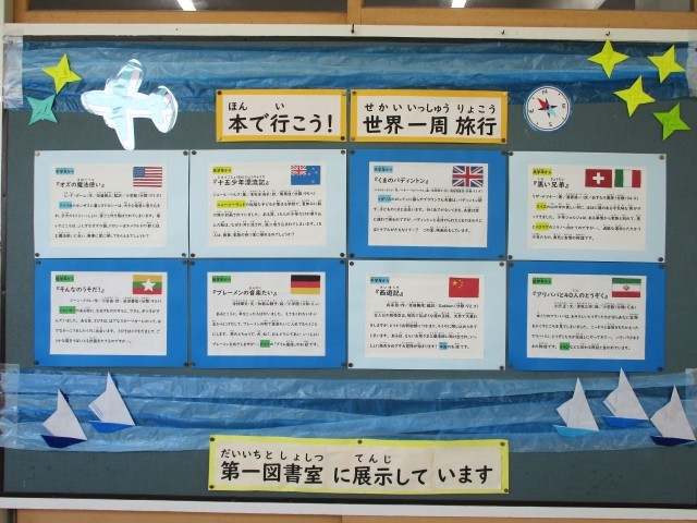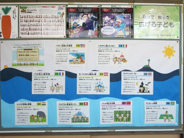 7月の図書室前の掲示です。「本で行こう!世界一周旅行」と題して、様々な国の本を紹介しています。
