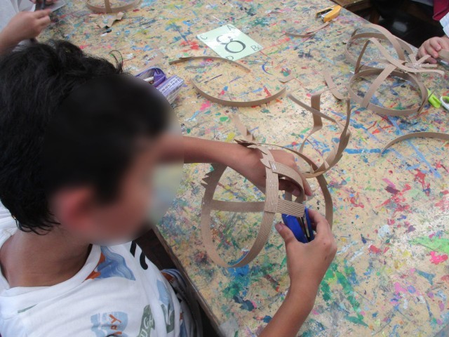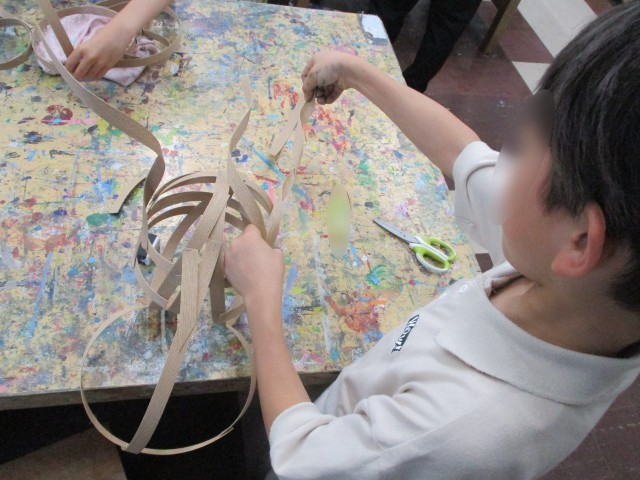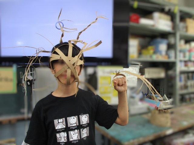 図工【4年生】 公開日 2025/07/09 更新日 2025/07/09 今日のできごと 「つないで組んですてきな形」の学習です。紙テープをステープラーを使って組み立てたり、紙テープを切ったりして、帽子やマスクを作っています。楽しみながら発想を広げていました。 いいね(2)