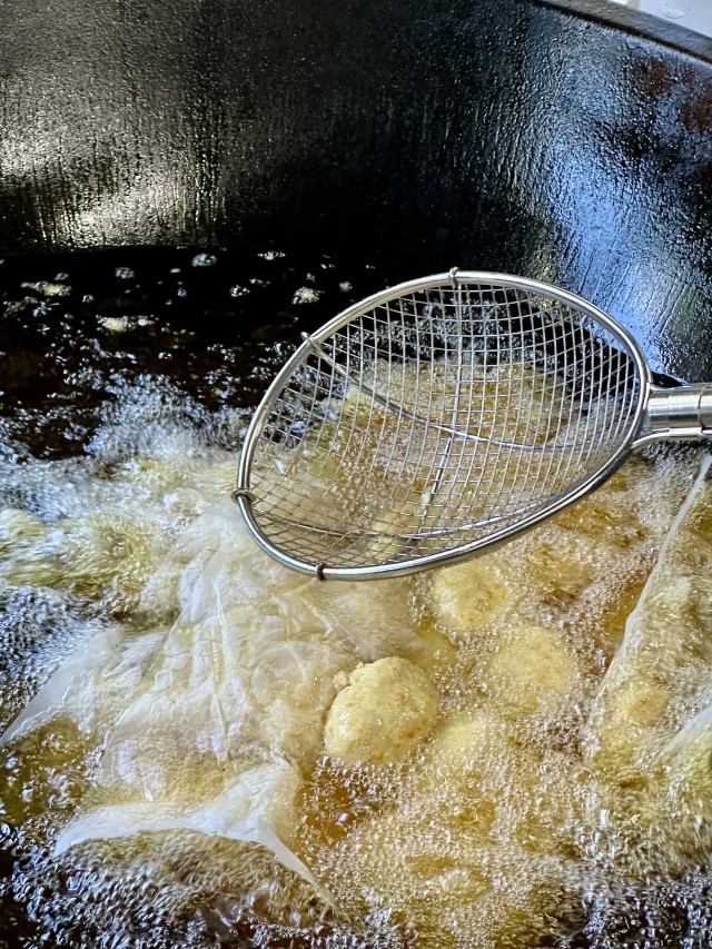 衣のないコロッケのような料理でウスターソースにくぐらせて食べます。