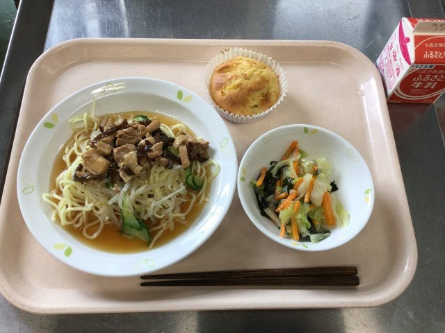 本日の献立 冷し中華 牛乳 わかめサラダ パインケーキ