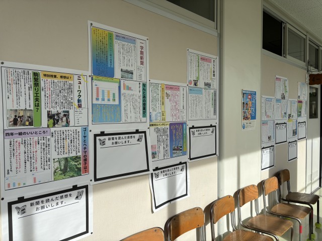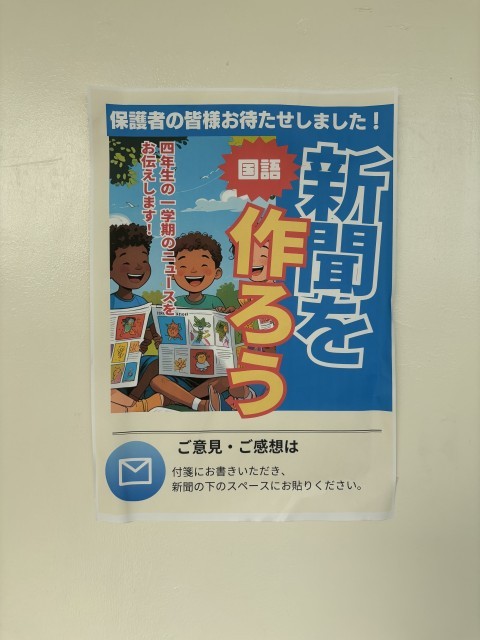 暑い中、面談に来校くださりありがとうございます。4年生の廊下には国語の授業で班ごとに作成した新聞を掲示しています。子どもたちが見出しや取材方法を工夫した1学期のニュースをぜひご覧ください。付箋も用意してありますのでぜひコメントもよろしくお願いします。