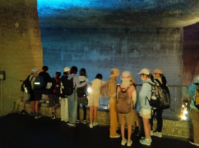 地下に下っていくにつれてどんどん涼しくなり、見学場所の気温は12度!児童たちも驚いている様子でした。