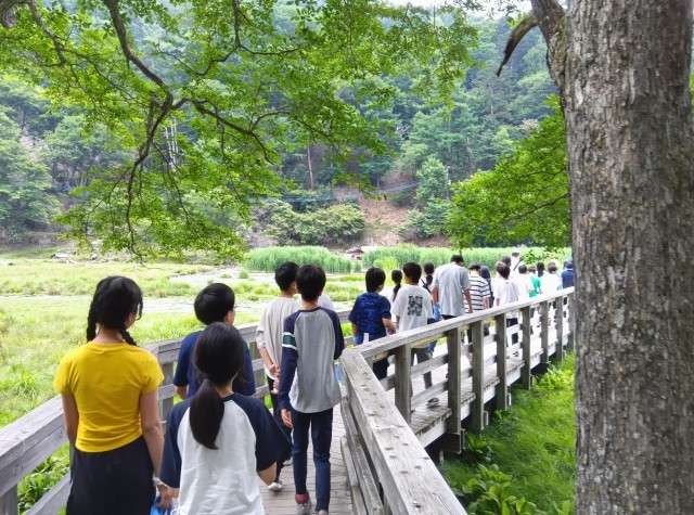 戦場ヶ原から湯元へ移動し、湯滝や源泉の見学をしました。滝の迫力や硫黄の匂いなど、一つ一つのことに感動しながら学びを深めている様子でした。