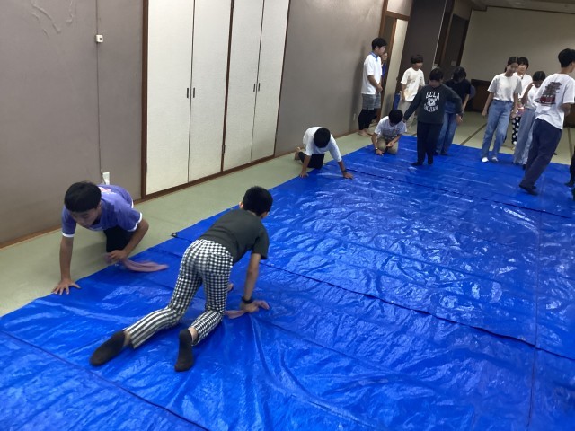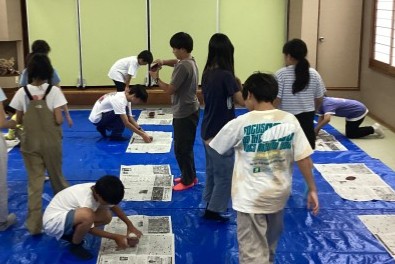 絵付け体験の後で、使った部屋の片付けをする生活係さんの様子です。汚れている箇所を探してしっかりと雑巾で拭き取りました。ブルーシートの畳み方は非常に丁寧で、工房の先生にも褒めていただきました。