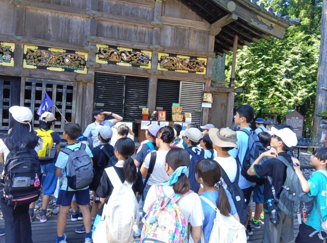 東照宮の成り立ちや、有名な彫刻についてお話を聞き、学んでいます。